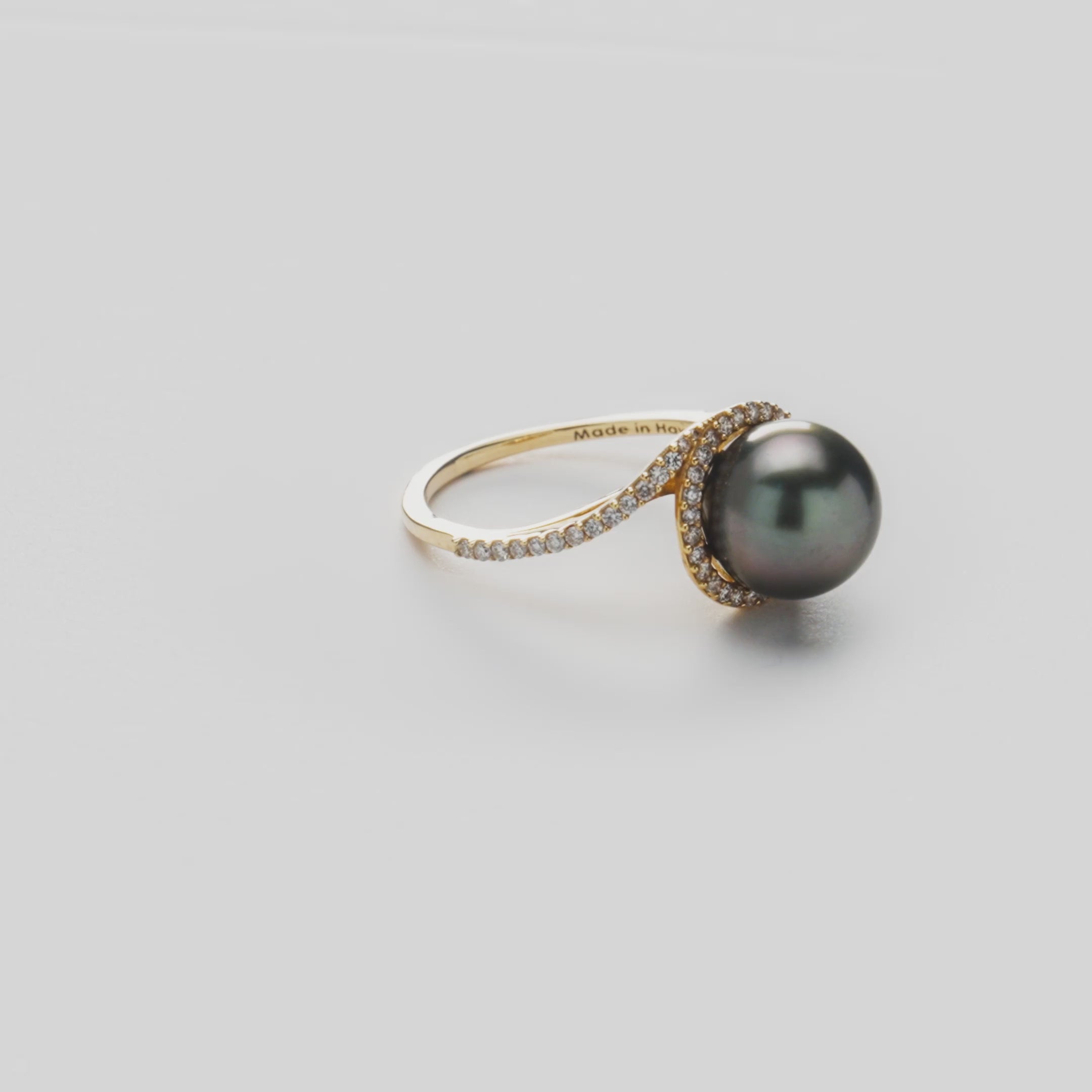 Halo Bypass Tahitian Black Pearl Ring in Gold with Diamonds - 9-10mm