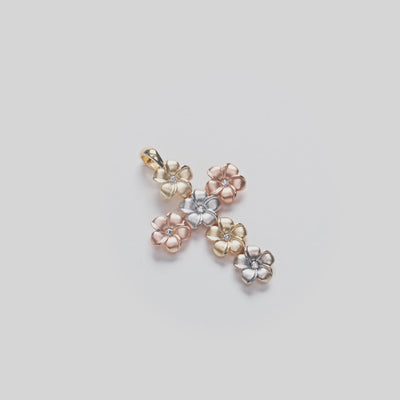 Plumeria Cross Pendant in Tri Color Gold with Diamonds - 25mm