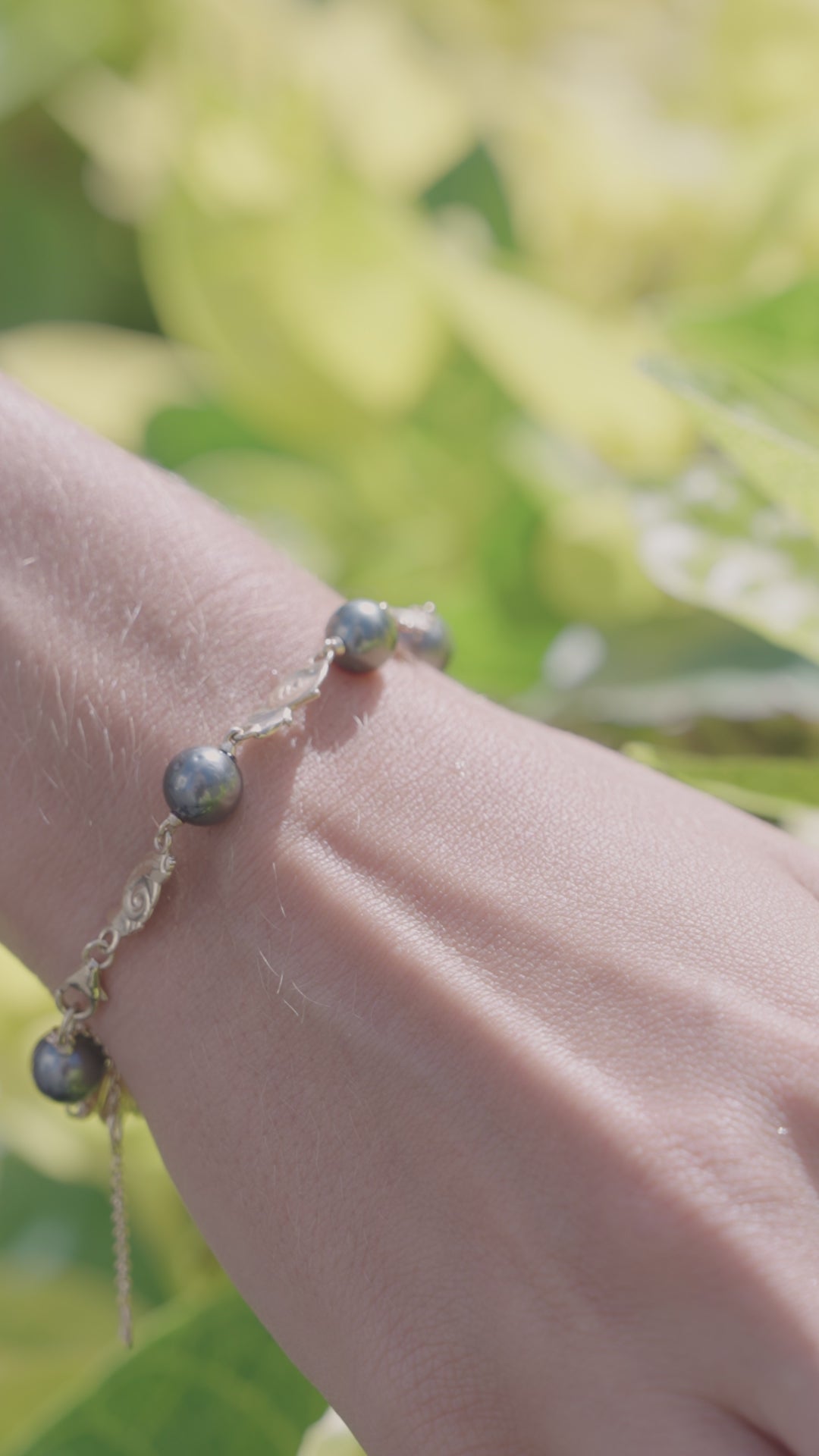 7-9" Adjustable Seashells Tahitian Black Pearl Bracelet in Gold